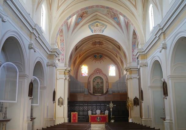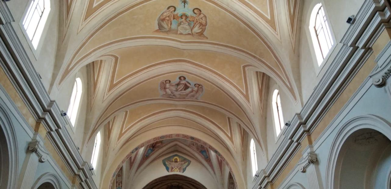 La navata centrale è invece chiusa da volte a stella, eventualmente lunettate (Fig. 5). Le decorazioni interne sono prevalentemente costituite da tinteggiatura uniforme, ma i lavori di restauro operati tra il 2008 e il 2010 hanno messo in luce affreschi eseguiti tra il 1700 (in corrispondenza dell’antico fonte battesimale) e il 1850 (sulle volte della navata). L'interno ospita anche piccole cappelle laterali con pregiate tele del '700.