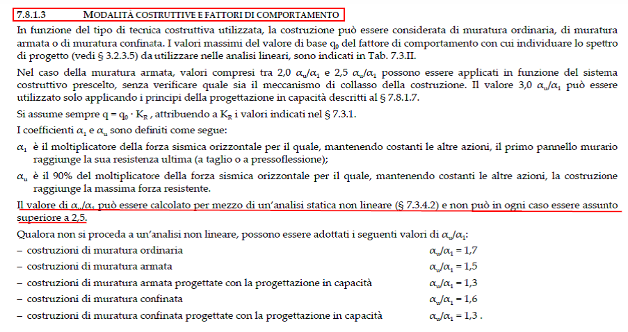 Il fattore di comportamento q ricavato dall'analisi pushover viene calcolato in base al rapporto (αU/α1) cioè fra il 90% del taglio massimo alla base e il taglio alla base corrispondente al raggiungimento della resistenza ultima (a taglio o a pressoflessione) del primo pannello murario.