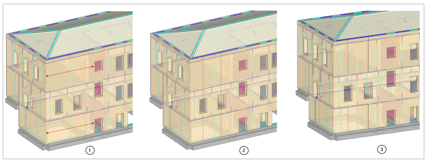 ➂ Sono stati così generati maschi del piano secondo in grado di trasmettere correttamente il carico ai sottostanti maschi del piano intermedio, i quali a loro volta trasmetteranno correttamente il carico ai maschi del piano terra. I maschi ottenuti dalla suddivisione sono visibili nell'immagine in filigrana attraverso la rappresentazione dei loro assi corrispondenti alle aste del telaio equivalente; si noti la diversa configurazione del telaio nella figura ➂ rispetto alla ➀: questo per ribadire che il telaio equivalente è un'ottima modalità di modellazione purché rispetti il più possibile la reale diffusione dei carichi evitando contemporaneamente pareti troppo lunghe che non avrebbero corretta rappresentazione nei confronti della rigidezza.