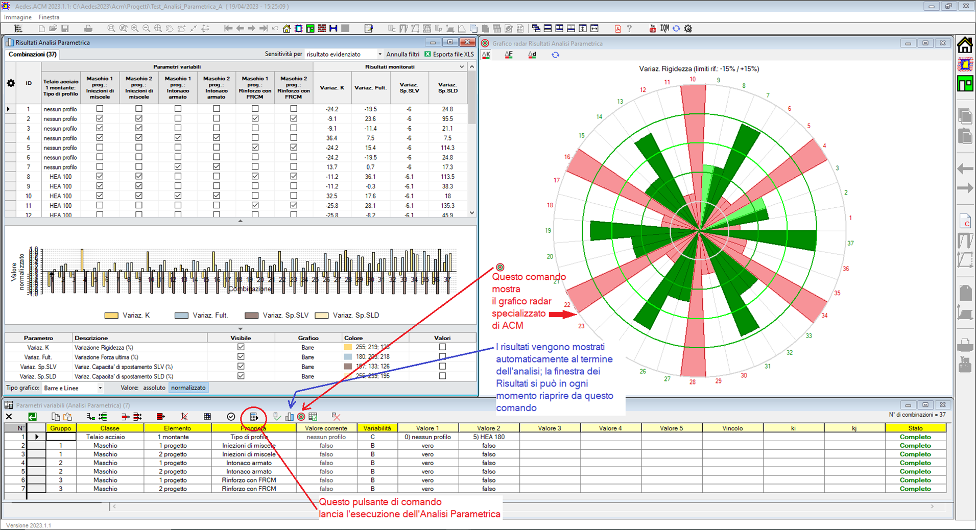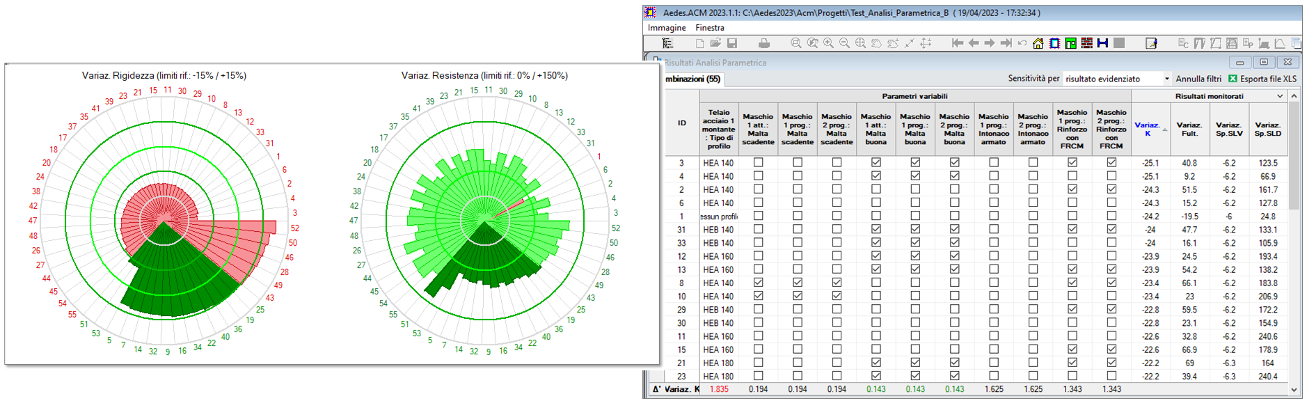 A partire dalla versione 2023, Aedes.ACM propone l’Analisi Parametrica, cioè l’elaborazione automatica di una serie di verifiche di sicurezza, in termini di rigidezza, resistenza e capacità di spostamento, considerando la variazione di alcuni parametri definiti dall’utente. Attraverso l’Analisi Parametrica è possibile ottimizzare il progetto di consolidamento a seguito delle modifiche su pareti in muratura, e inquadrare correttamente i tipi di intervento che rispettano i criteri per la Riparazione Locale.