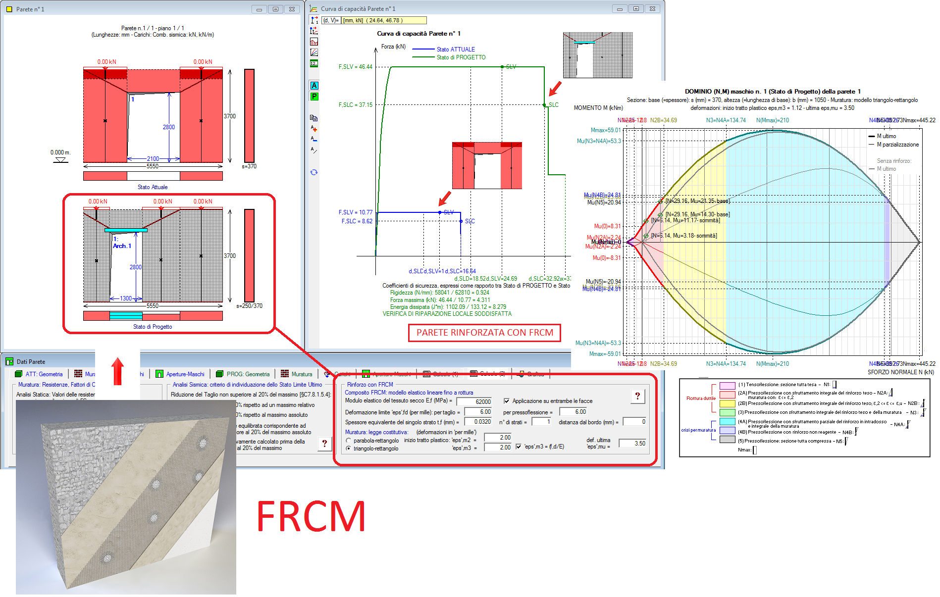 In ACM i parametri del rinforzo vengono specificati in un'apposita sezione dei Dati Parete. Questa tipologia di intervento può essere assegnata ad ogni elemento resistente della parete: maschi e fasce corrispondenti alle aperture. Il comportamento strutturale si determina, come in PCM, attraverso l'elaborazione del dominio di resistenza, dove viene proposto il confronto fra la frontiera della parete originaria e quella espansa grazie all'intervento con il composito.