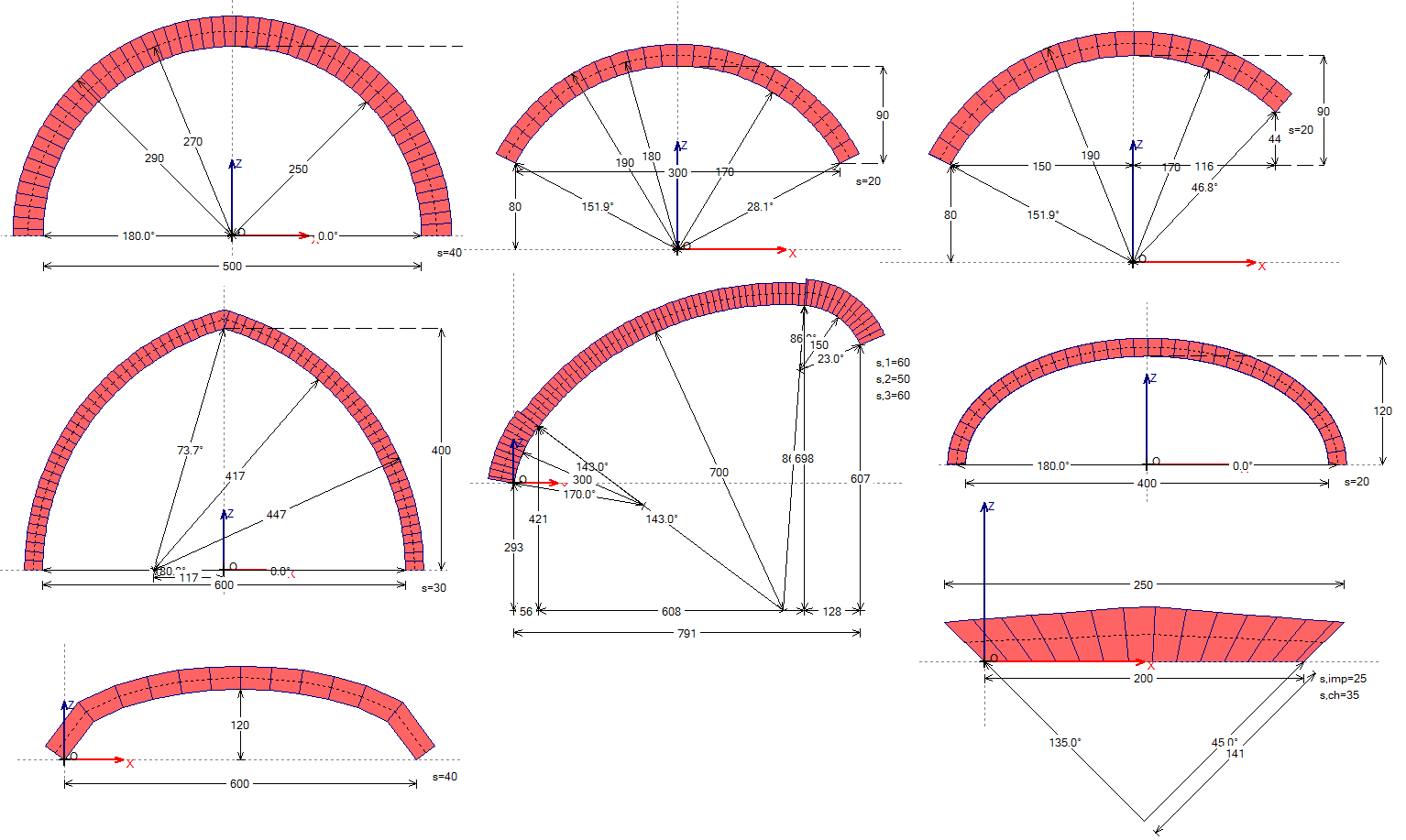 Geometria degli archi: circolare a tutto sesto, con spessore costante o variabile; a sesto ribassato (con spessore costante o variabile); zoppo; a sesto acuto (con spessore costante o variabile); policentrico; ellittico (con spessore costante o variabile); definito per punti (curvatura generica in input per punto o via file dxf); piattabanda.